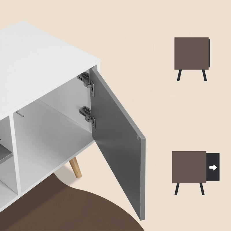 Our mid-century TV stand highlights your living room with a stylish design and a rustic look. The frame is made of high-quality wood to have a long time of use. Equipped with two private storage spaces and an open storage area, convenient for you to access a variety of small items in a timely manner. The cabinet door is designed to open and close with a simple press, so you can kiss goodbye to annoying handles and give your furniture an avant-garde design. In addition, our TV cabinet is also thoughtfully designed with holes to facilitate the passage of wirings, you could easily use various appliances.