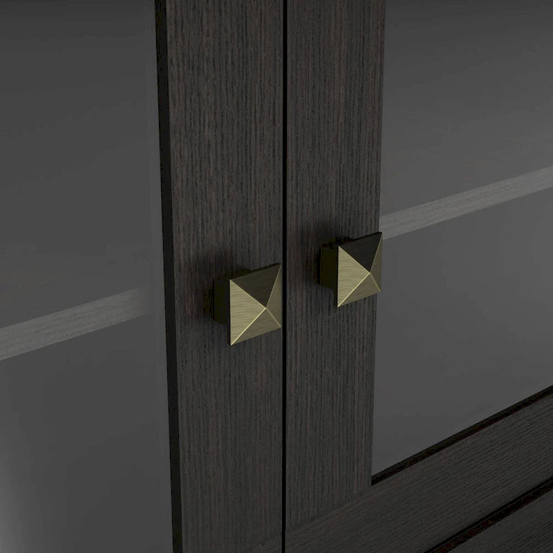 Style your living room with the DENHOUR BASIC Transitional Espresso 62-inch TV Stand with Storage. The TV stand features glass-paneled cabinets that slide open and rear wire hole cut-outs. The arched accents and square pyramid knobs add appeal.