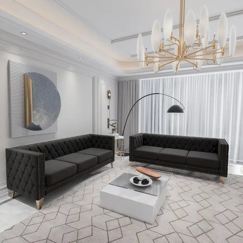 2-Pieces Velvet Upholstered 3 Seat Sofa, Classic Chesterfield Couch Buttons Tufted Square Arm Sofa with Nailheads and Metal Legs